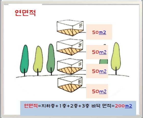 연면적은 각 층의 바닥면적의 합계를 연면적이라고 해요.