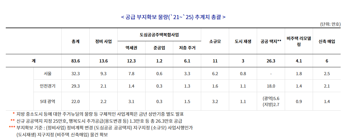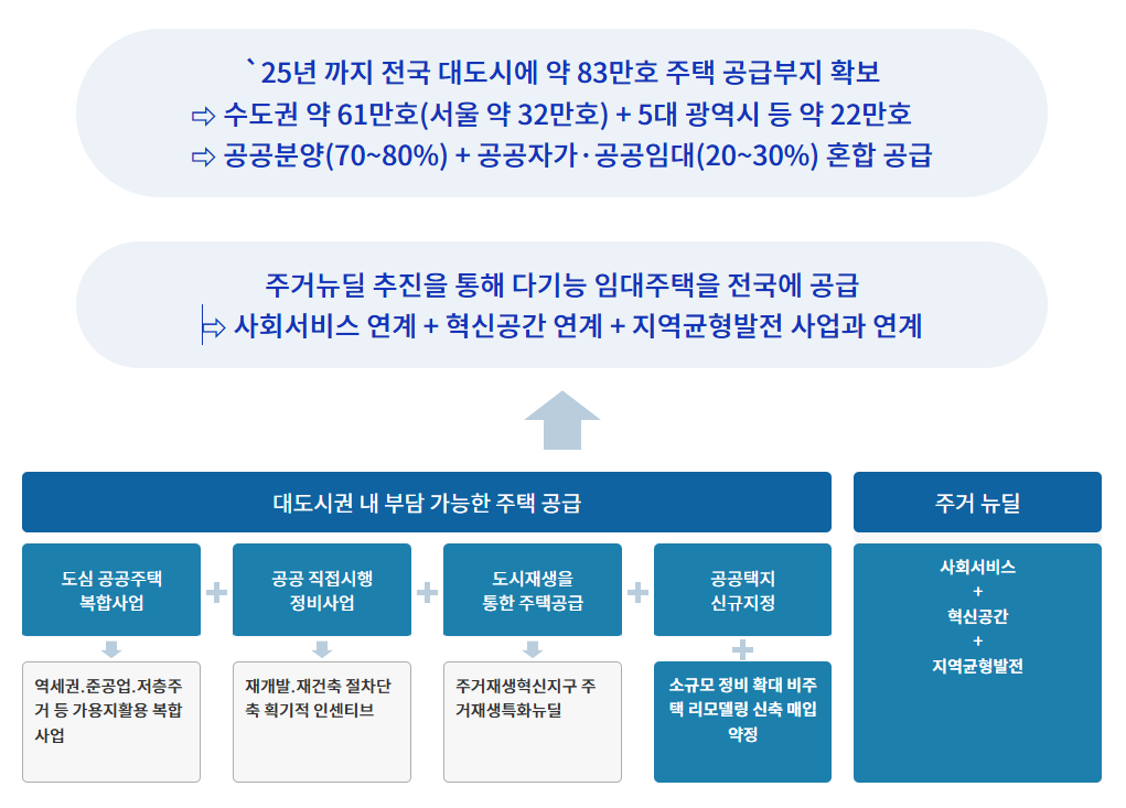 현 2025년까지 전국에 위치한 대도시의 정비를 개설하여 수도권(경기, 인천 약 29만호 포함 + 서울 약 32만호) 약 61만호 및 5대 광역시 22만호로 전체 약 83만호의 주택의 공급부지를 확보를 진행할 계획이며, 공공분양 70~80% + 공공자가 및 공공임대 20 ~ 30%를 혼합 공급하여 도시 재생 및 정비사업을 진행해 사회서비스 및 지역 균형 발전을 통해 도시기능 개편화를 진행할 계획