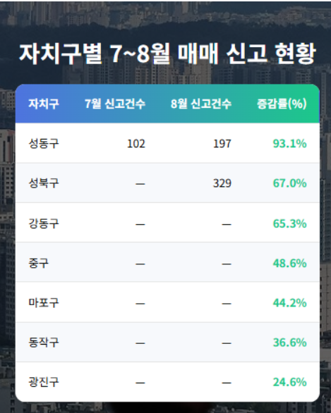 9·7 대책 발표 직전부터 마포·성동 및 동작·강동 등 한강 주변 지역에서 거래가 증가하고 신고가 사례가 잇따른다는 보도가 많습니다. 예컨대 성동구 아파트 거래량**이 8월에 102건 → 197건**으로 증가했고, 마포구도 전월 대비 두 자릿수 증가율을 보였습니다. 가격 측면에서도 금호동, 성수동, 아현동 등의 단지에서 신고가 돌파 사례가 반복되고 있으며, 상승률 또한 이전주 대비 상승폭이 확대되고 있는 지역이 많습니다 (성동구, 마포구 등).