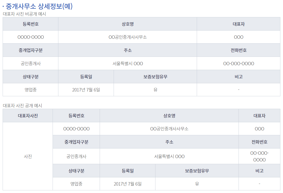 - 국가공간정보포털 : 대표자 사진, 소재지, 상호, 현재 영업상태, 중개보조원 현황 등
