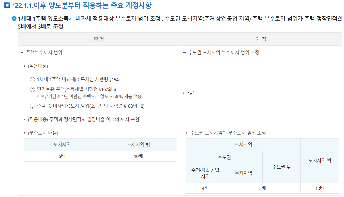 - 기존 : 토지 + 주택이 도시지역 안에 속해 있는 경우, 주택정착 면적의 5배 / 수도권 내 주거, 상업, 공업지역 3배 도시지역 밖에 있는 경우, 10배까지 1세대 1주택 범위로 양도소득세 과세 대상 x.