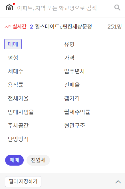 매매 방식에서부터 난방방식까지 원하는 필터를 클릭 후 저장하시면 그에 맞는 정보를 확인해