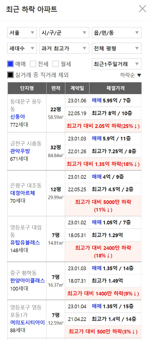 아실 어플을 보시면, 최근 하락아파트를 순서대로 확인해 보실 수 있으며, 그 밖에도 최고가