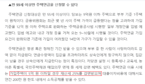 3) 주택연금 신청자 감면 : 주택연금 신청대상은 55세 이상이며, 가입 주택이 5억 원 이하일