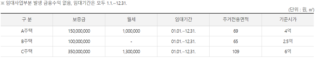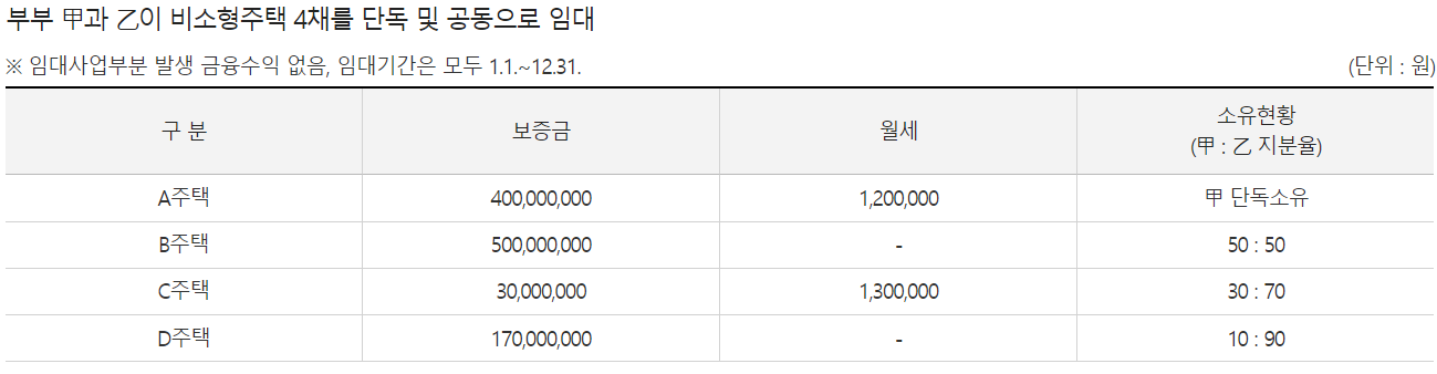 - 단독으로 소유하는 A 주택은 별도의 간주임대료 계산을 함.