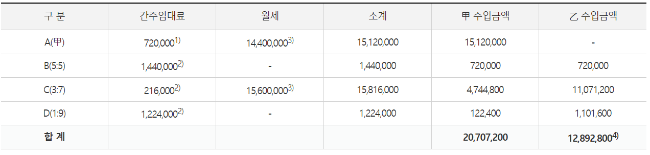 계산 : 간주임대료 + 월 임대료 / 공동명의 주택별 소득금액 계산 후 각 공동명의 주택의 손익