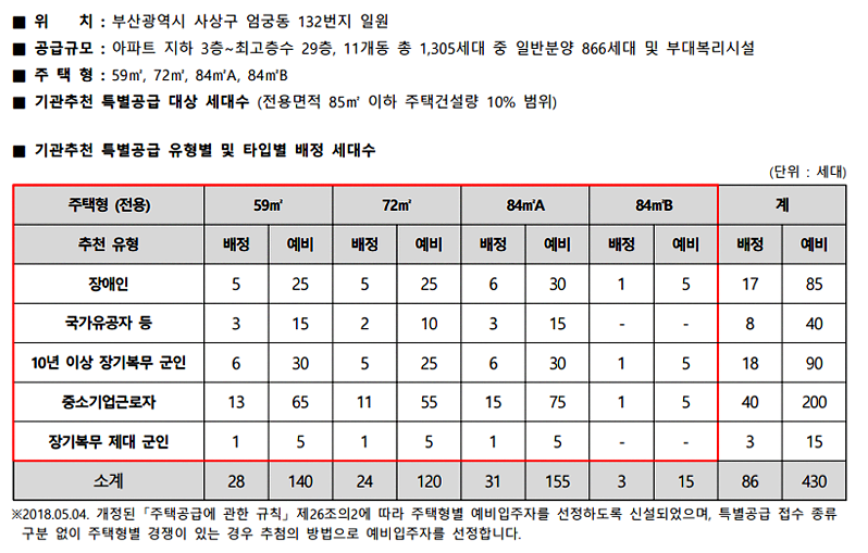 국가유공자, 장애인 등 기관추천 특별공급 물량 : 10% -> 86가구 배정 예정