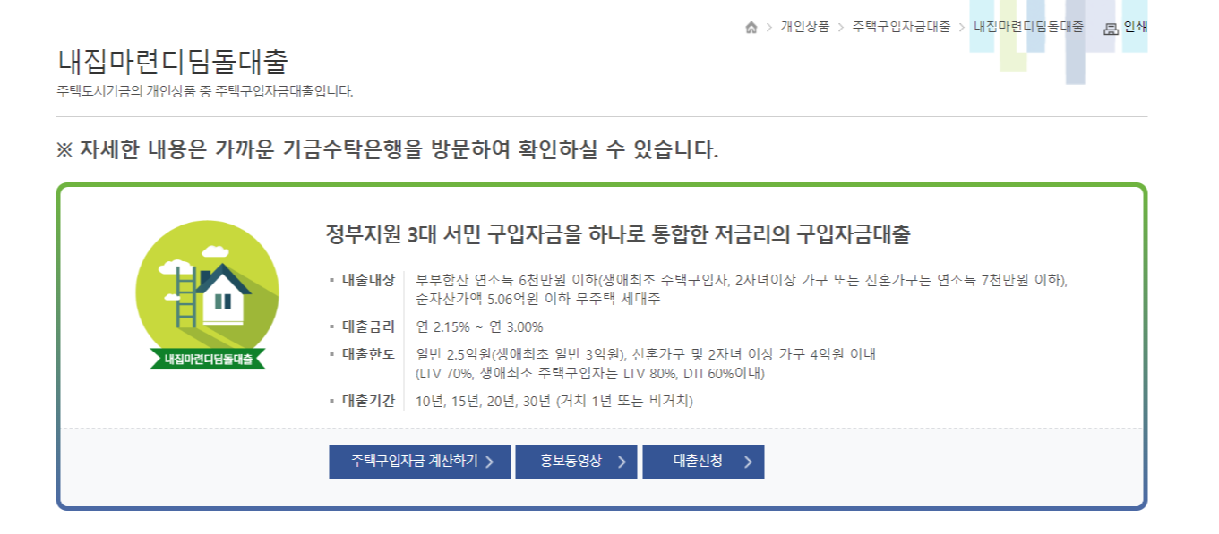 '내집 마련 디딤돌 대출'과 조건은 비슷하지만 금리가 낮은게 인상적이네요.