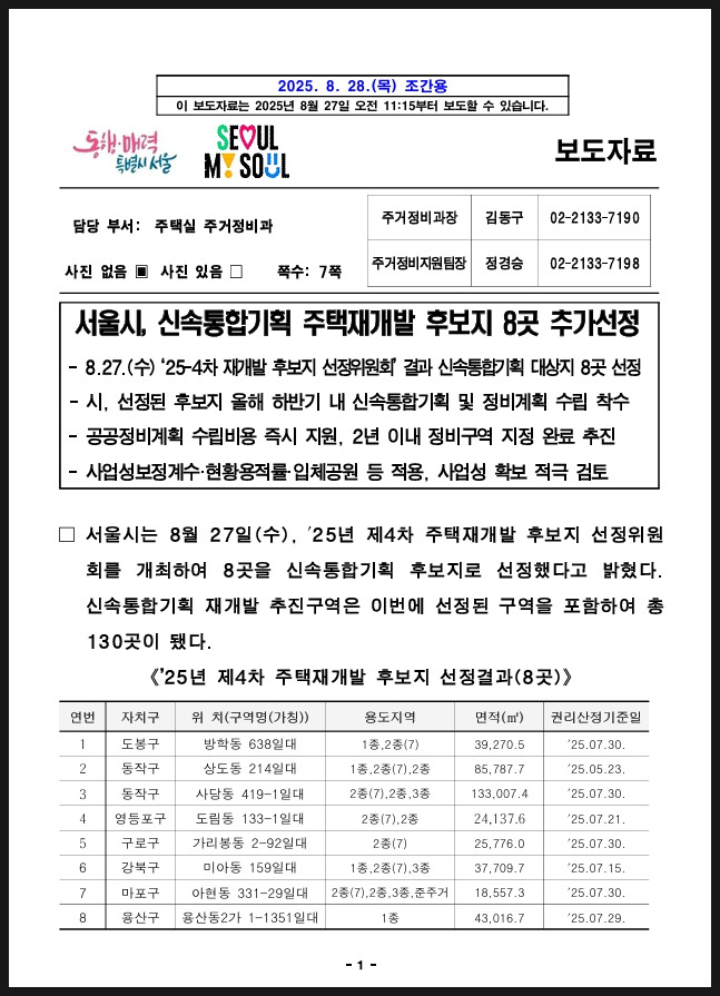 이번 후보지 선정으로 서울시와 영등포구가 정비계획 수립을 적극 지원하게 되었고, 기존 5년 이상 걸리던 정비구역 지정 절차를 2년 이내로 단축하겠다는 계획이 발표되었습니다. 이로 인해 사업 속도가 기존 재개발 대비 훨씬 빨라질 가능성이 큽니다.