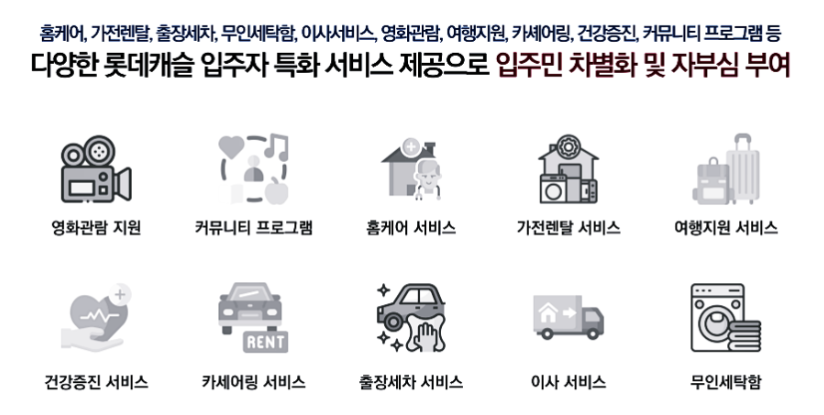 입주자 특화서비스 : 커뮤니티 프로그램, 홈케어, 출장세차, 건강증진, 가전렌탈, 여행지원,