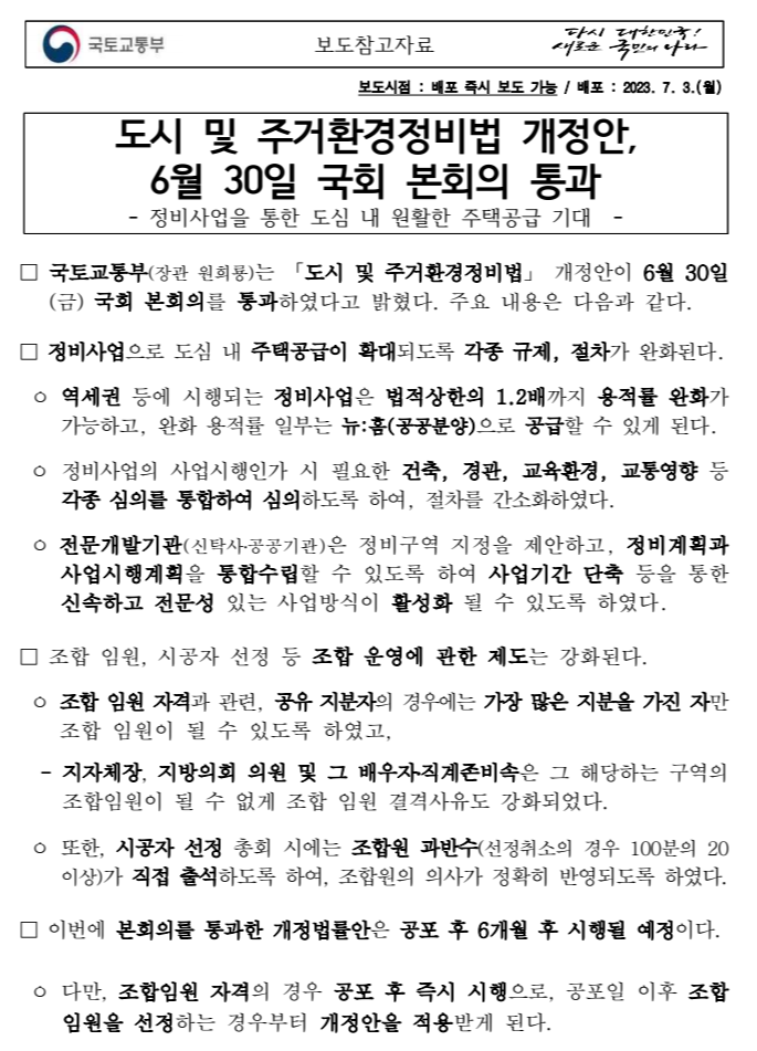 규정하기 위한 사안이며, 국토교통부는 재개발, 재건축 등의 정비사업의 규제완화와 절차 간소화 및 통합