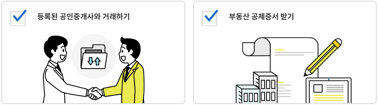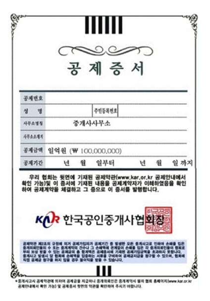 - 개업 중인 공인중개사는 공인중개사법 제 30조에 따라 보증보험 또는 공제상품에 가입해야하며 공인중개사의 과실로 계약자가 금전적인 피해를 입었을 경우 손해를 보증한다는 내용을 담은 '부동산 공제증서'를 발급하게 됨