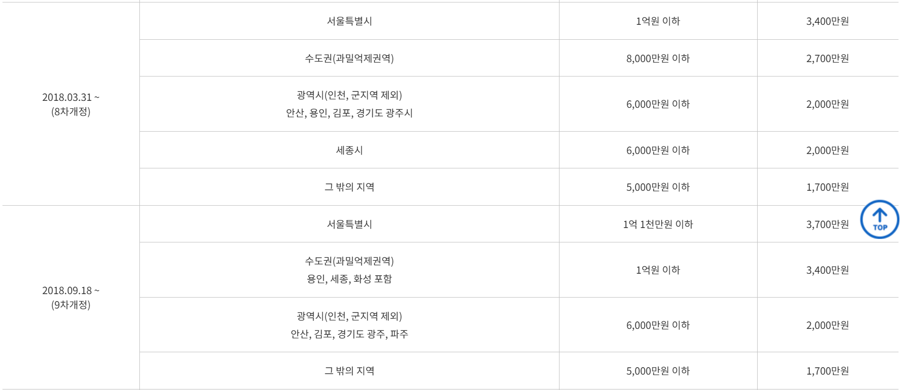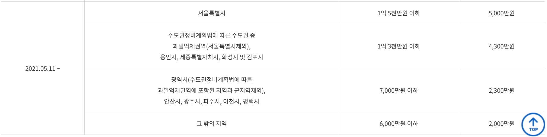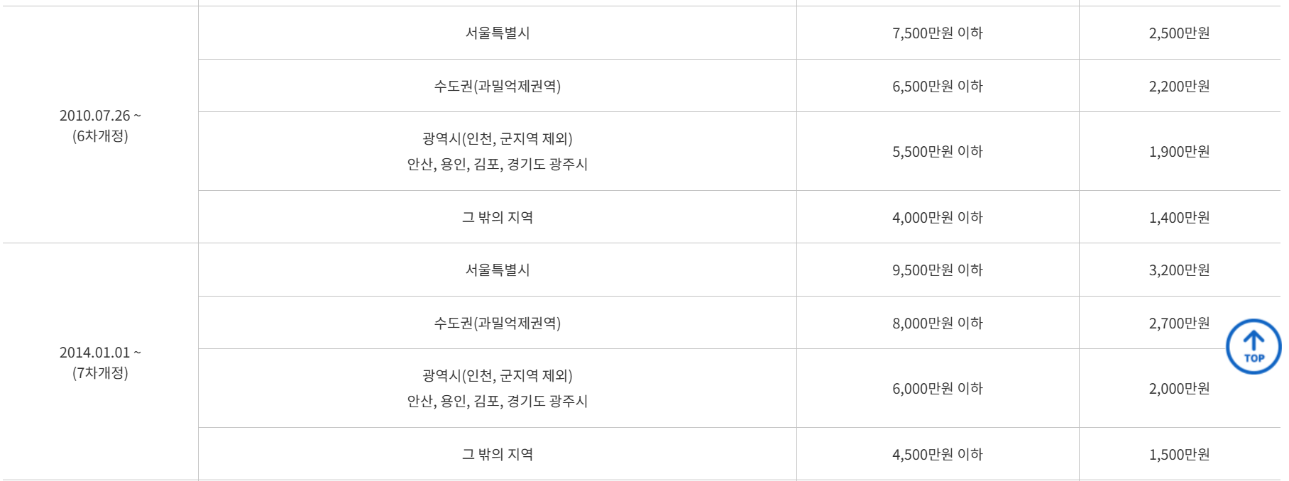 우선변제금액 기준은 임대인이 빚을 진 시점 기준으로 확인하여야 하며 위치한 지역에 따라 기준이 다르므로 아래 표를 참고해 주시길 바랍니다.