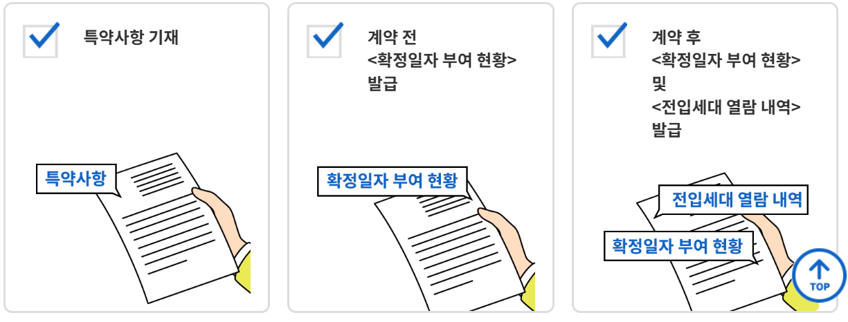 -> 계약 전 특약사항 기재 후 확정일자 부여 현황 확인(임대인 동의서, 임대인 신분증 사본, 인감 증명서 등 필요서류 구비 후 확정일자 부여 현황여부 발급)