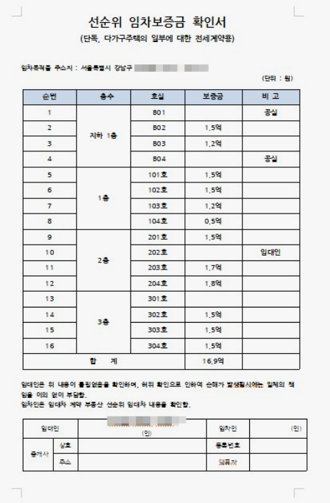 선순위 임차보증금 : 다가구주택에 먼저 거주하고 있는 동일한 등기 주소지의 세입자들의 임차 보증금 총합