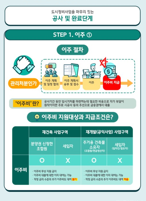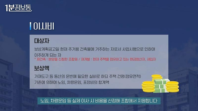 조합원은 이주비, 주거 이전비, 이사비 등을 받을 수 있는지 등등을 알아봐야겠죠?