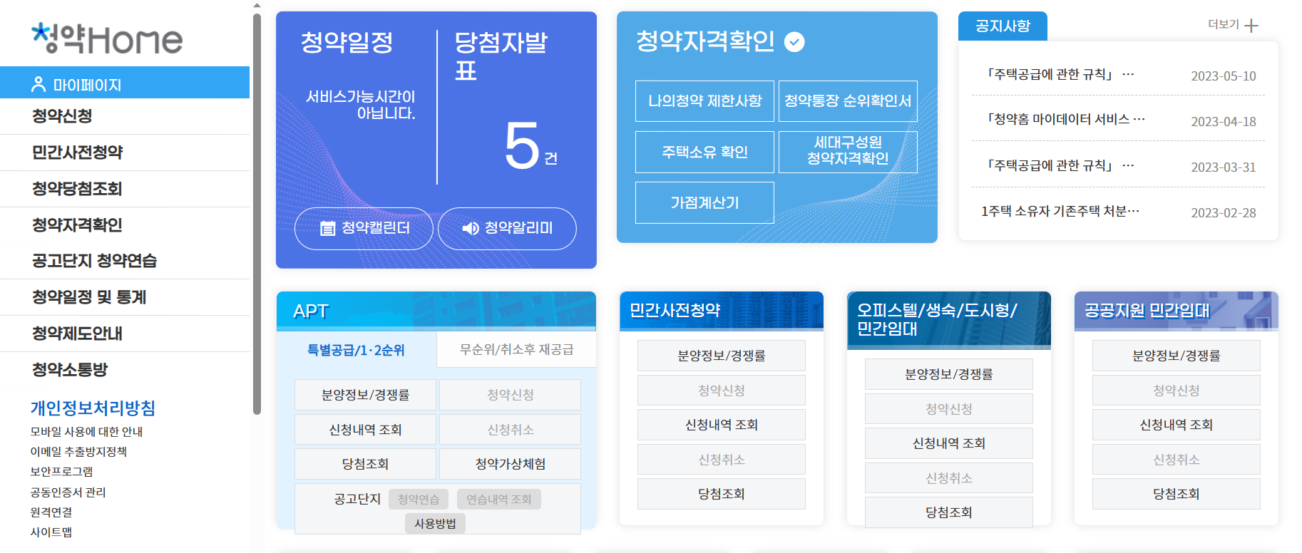 청약홈의 메인화면에는 청약일정이나, 당첨자발표일, 청약자격확인, 민간 사전청약 등등의