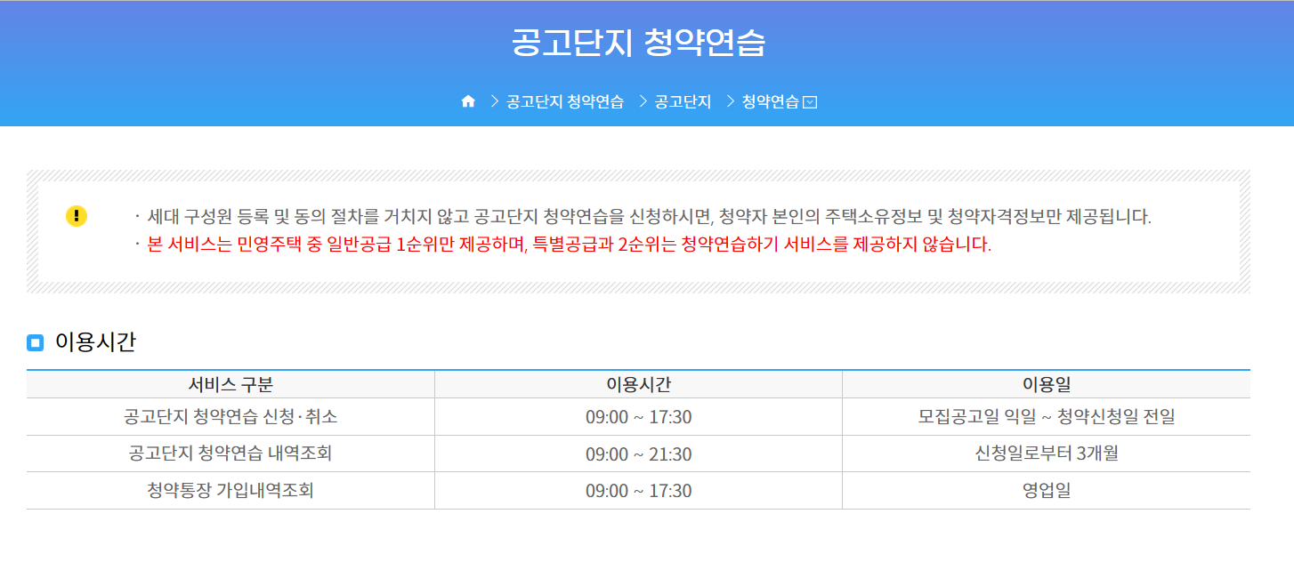 공고단지 청약연습에도 이용시간이 있기 때문에 필히 이용시간을 참고하시길 바라며, 또한 청약연습은 민영주택의