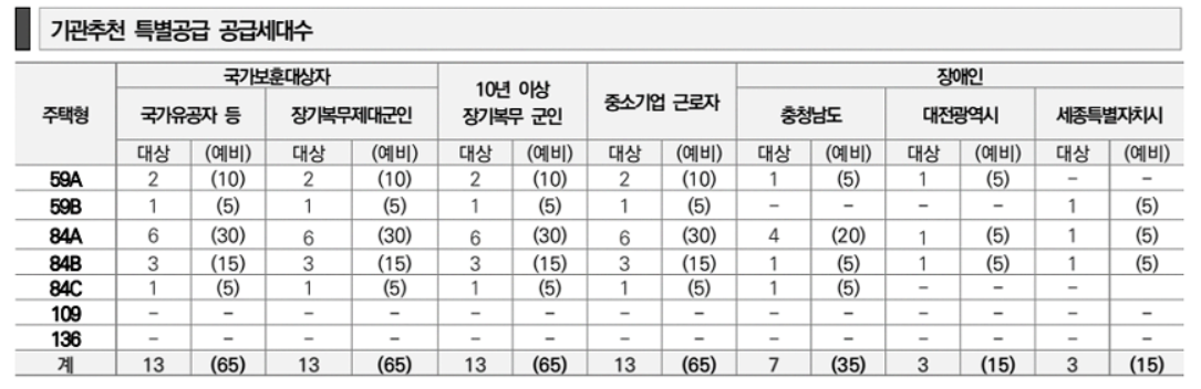 국가유공장, 장기복무군인, 장애인, 중소기업 근로자 등 기관추천 특별공급 65세대(예비 325세대) 배정